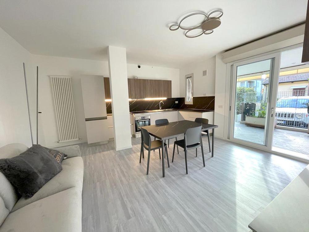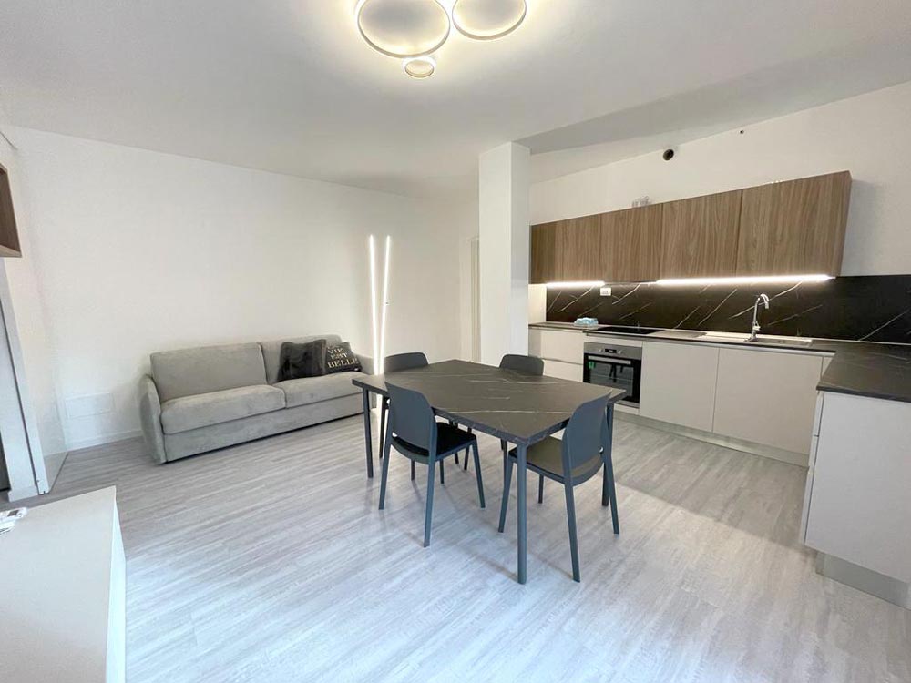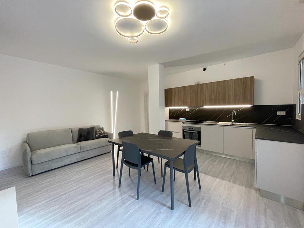 Divano letto nel soggiorno, fornelli ad induzione, climatizzatore, infissi in doppio vetro PVC.