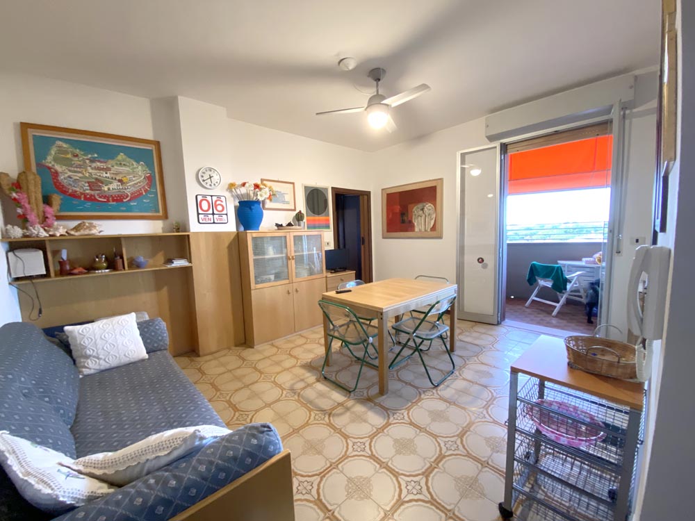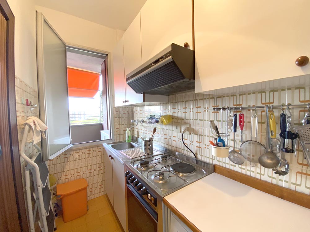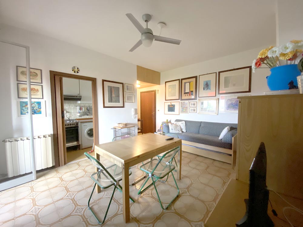 Ingresso su piccolo disimpegno che conduce alla zona giorno con cucina a vista e balconcino abitabile, ideale per pranzi e cene all’aperto.