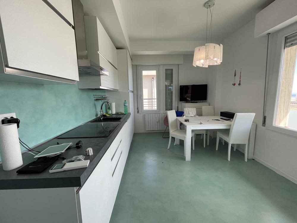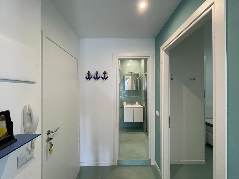 Ingresso su disimpegno che conduce al soggiorno con cucina a vista, divano letto e meravigliosa vetrata che illumina e conduce al romantico balcone per godere ogni momento della meravigliosa vista mare in prima linea.