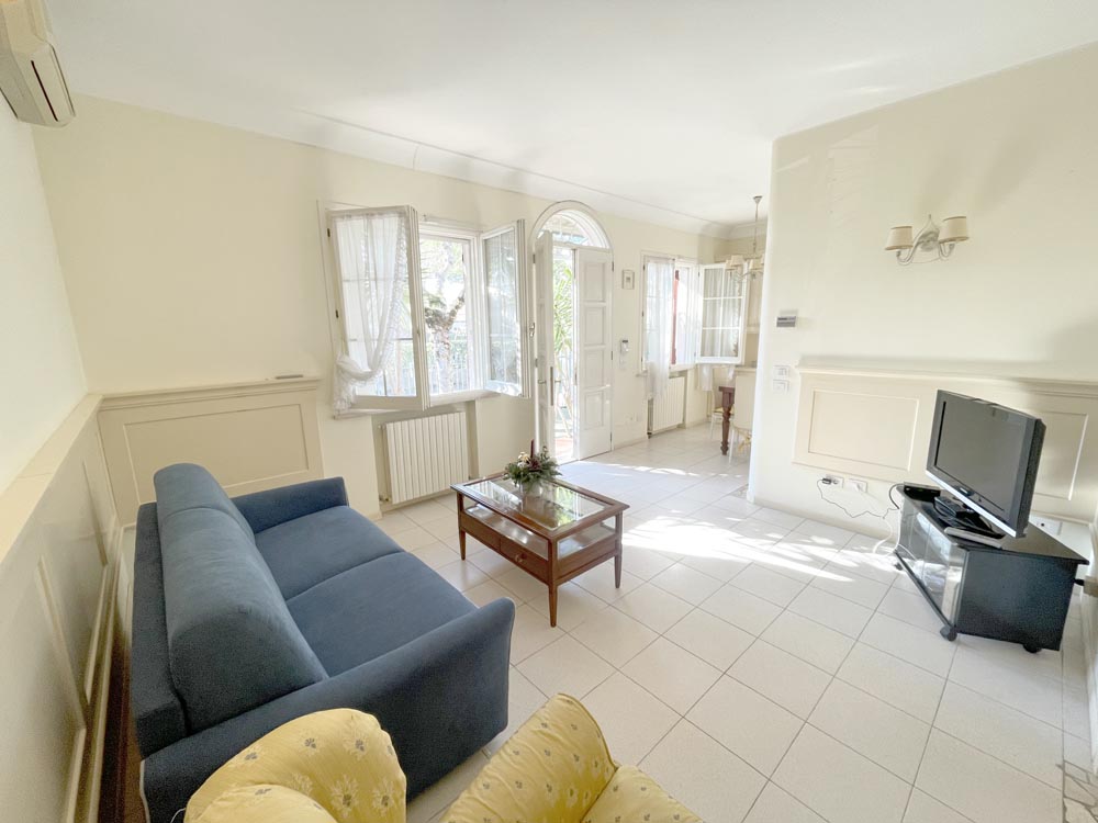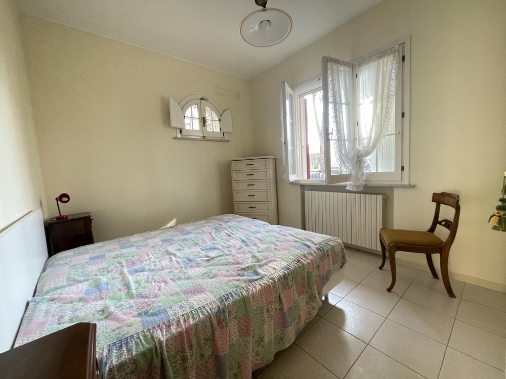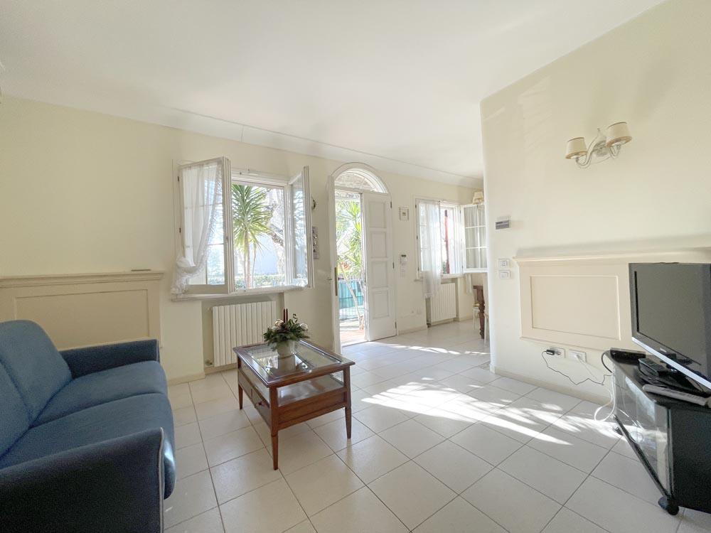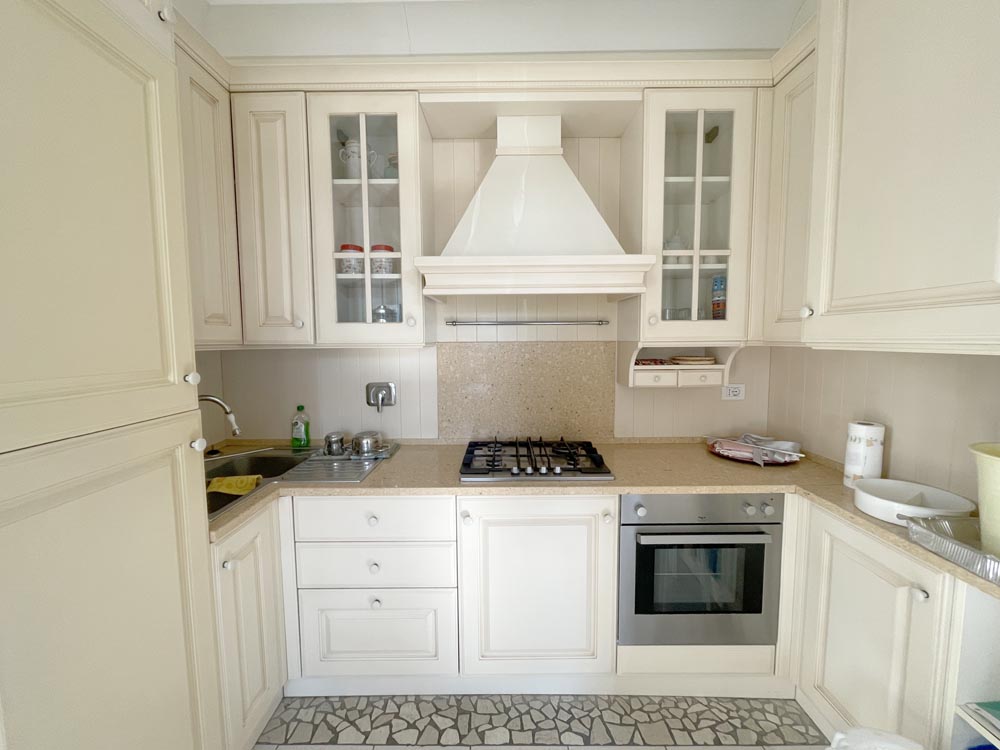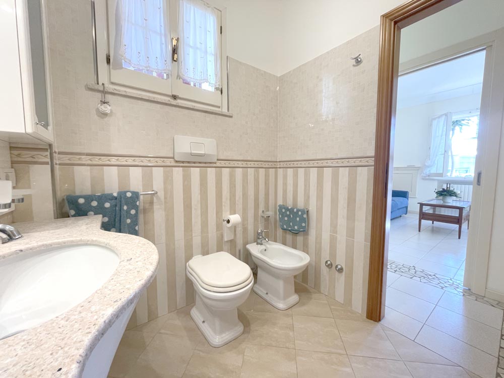 Ingresso su zona giorno con divano letto matrimoniale in soggiorno, cucina abitabile, disimpegno, camera matrimoniale, camera con due posti letto e doppi servizi al piano, entrambi finestrati uno con vasca e uno con box-doccia.