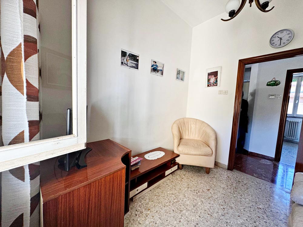 La sala, spaziosa e ben esposta, si apre verso l’esterno attraverso il più ampio dei due luminosi terrazzi, perfetti per godere della luce del giorno, immersi nella quiete del quartiere.