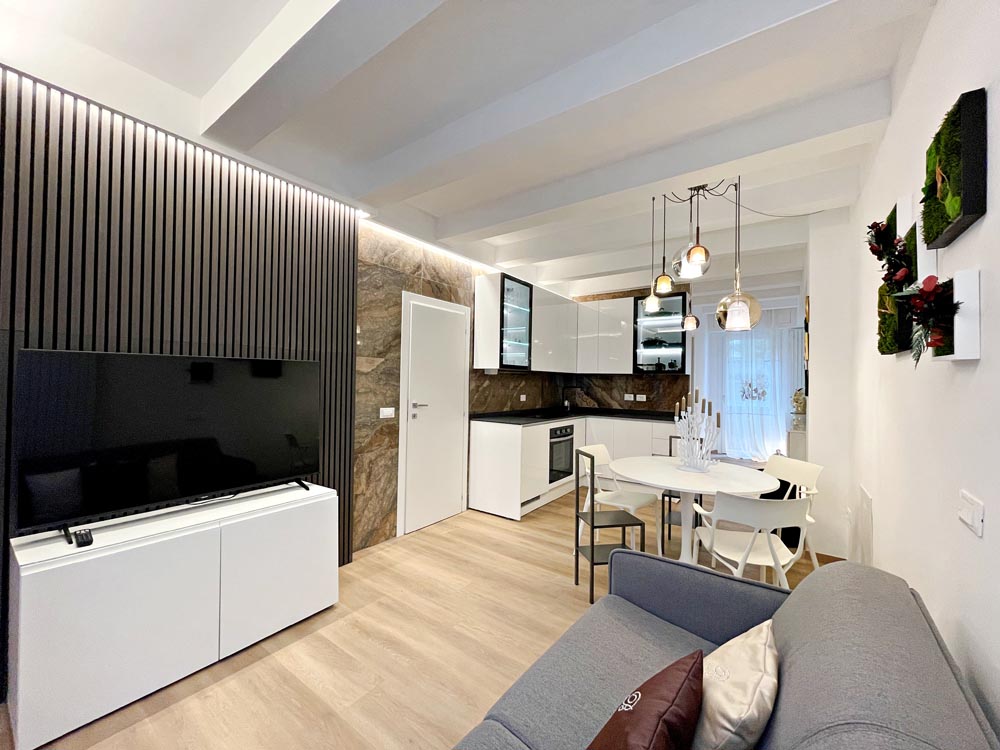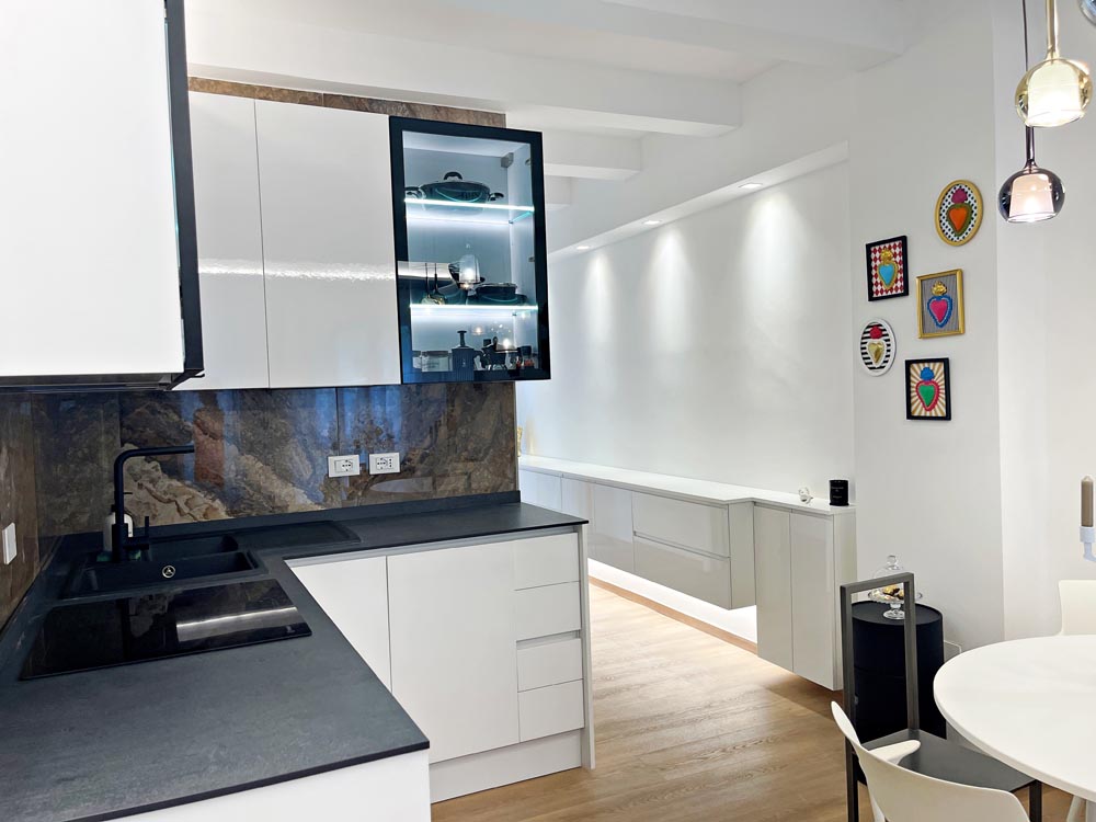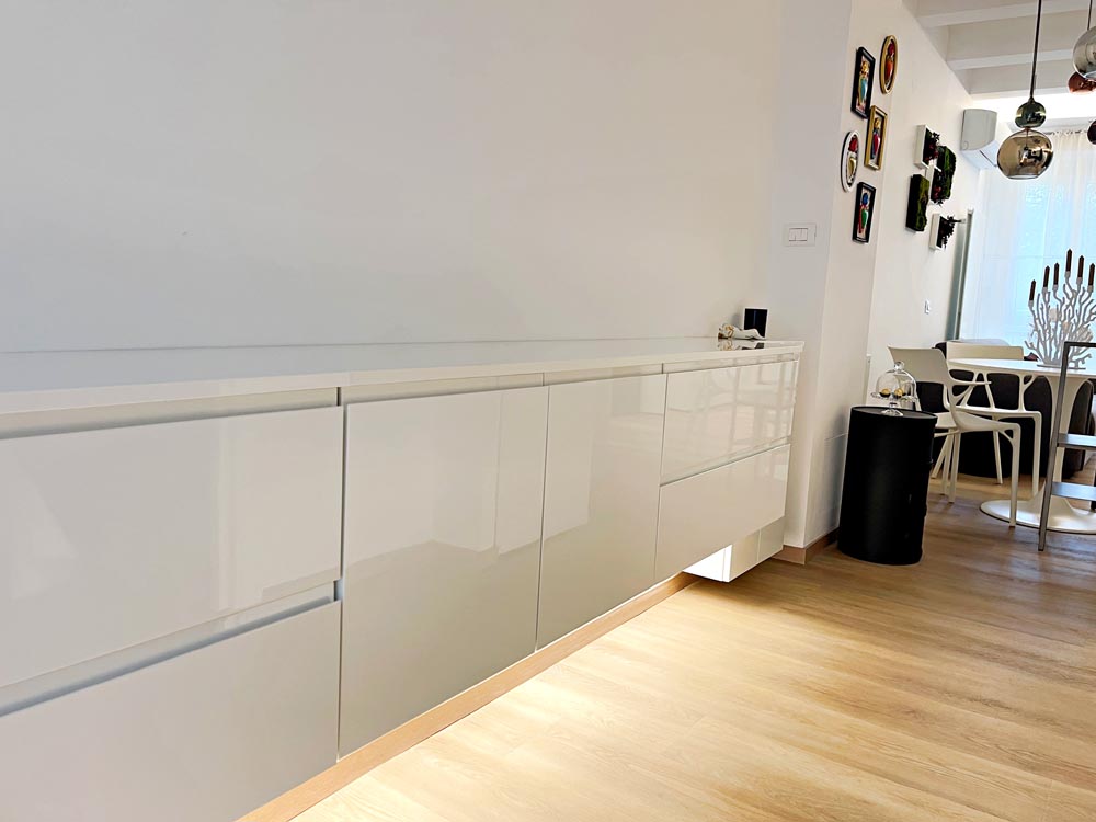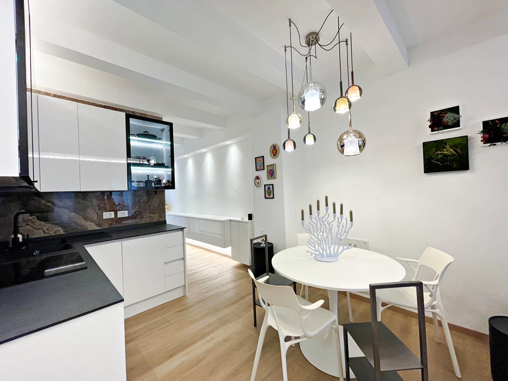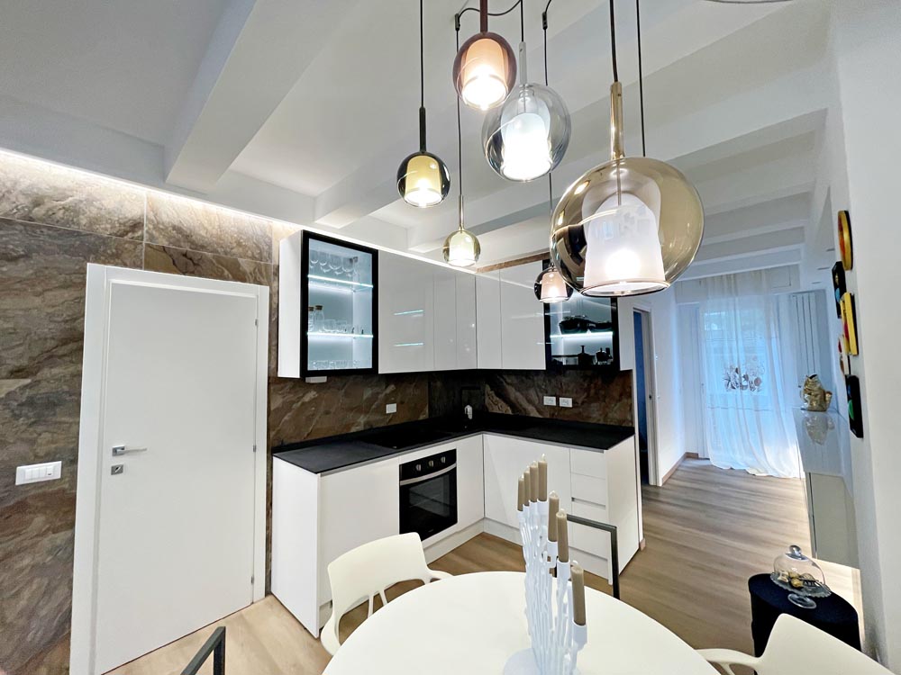 Ingresso in zona giorno con splendida cucina a vista, ampio e luminoso living e balcone alla francese che si affaccia alla passeggiata del centro di Riccione.