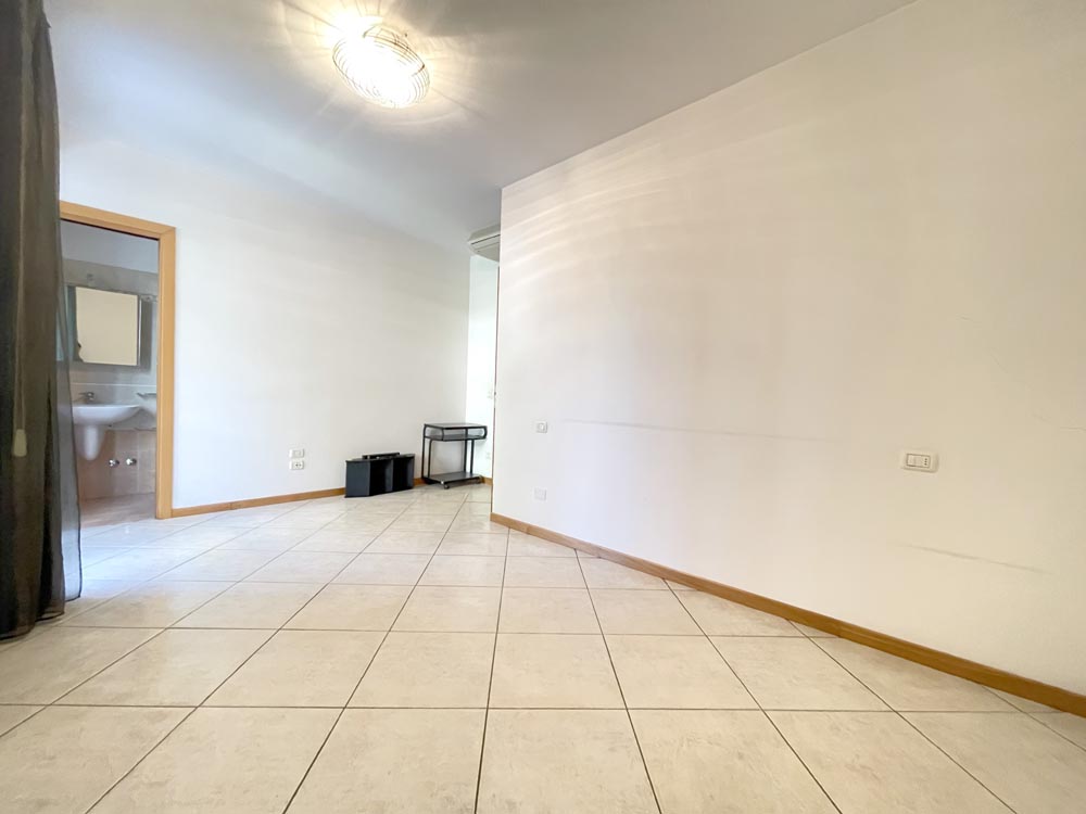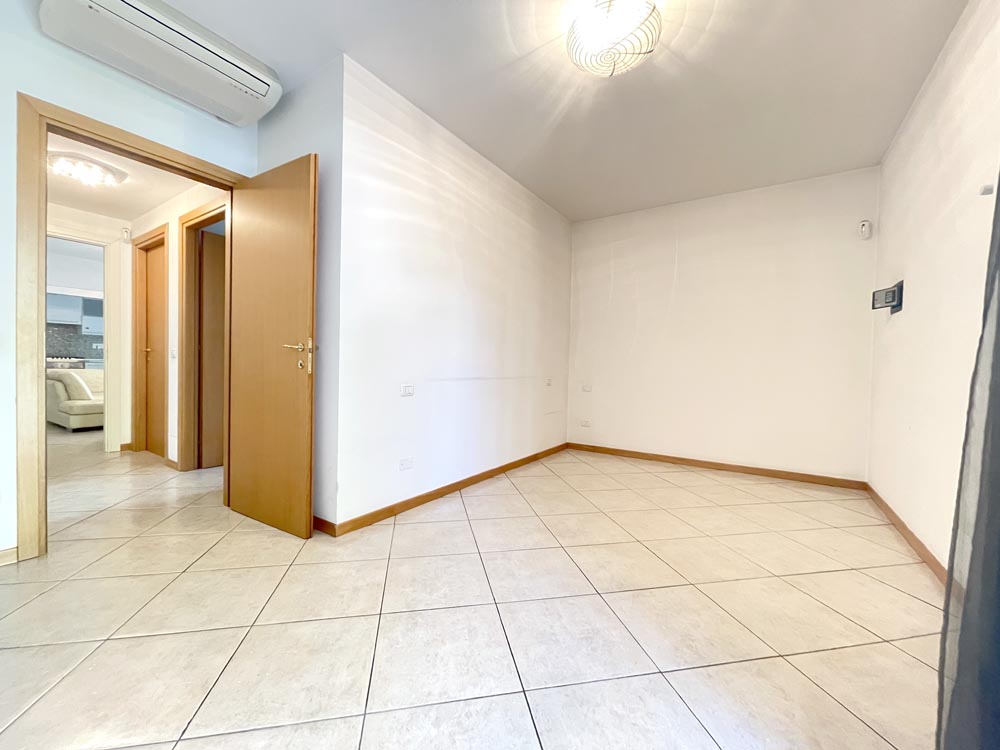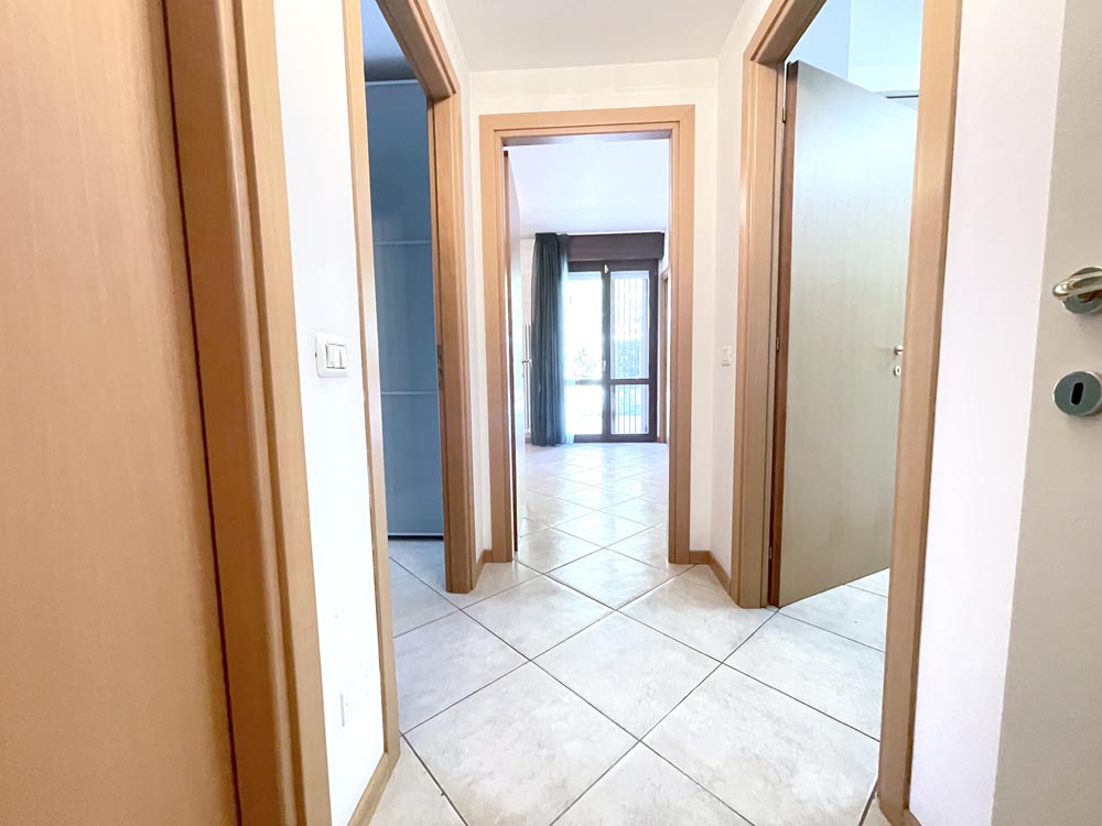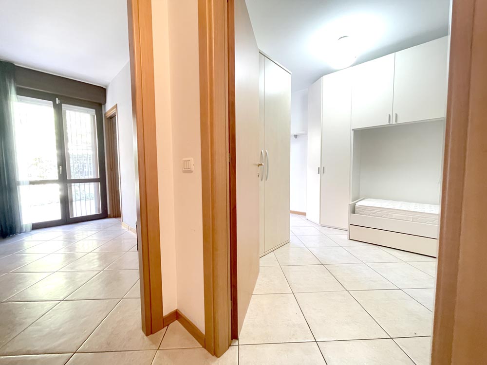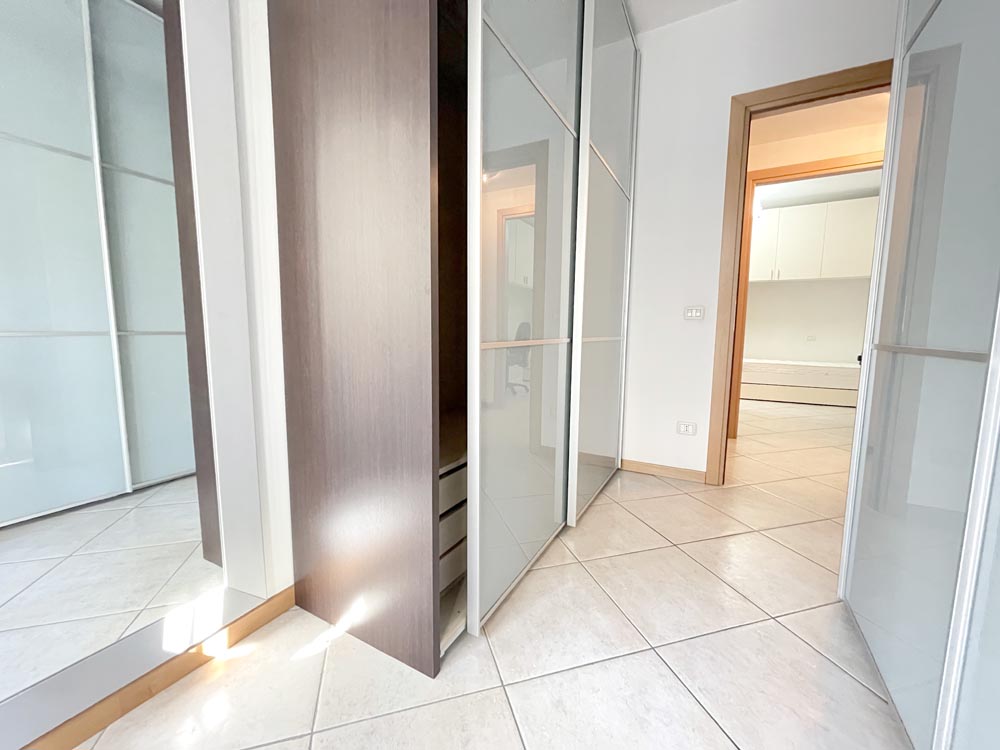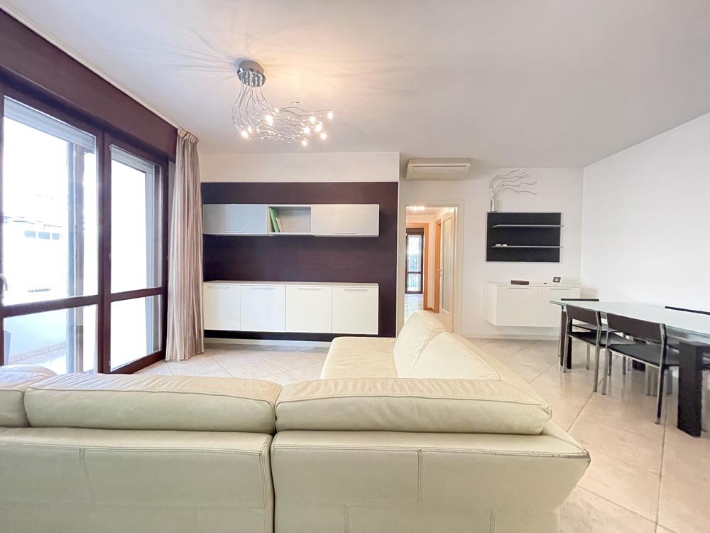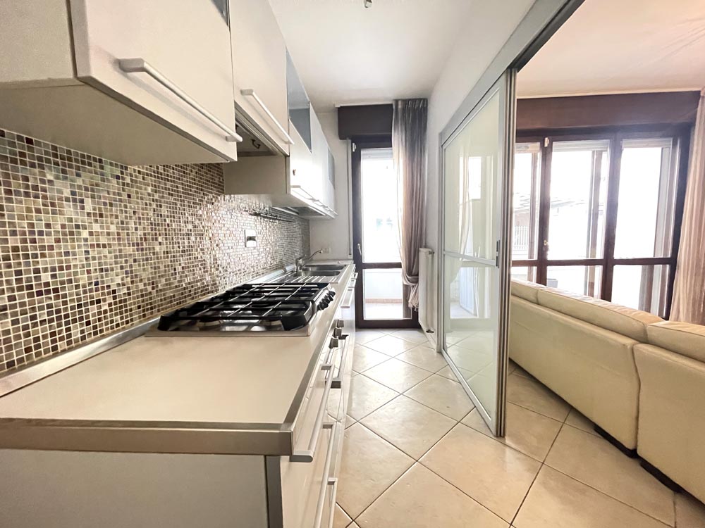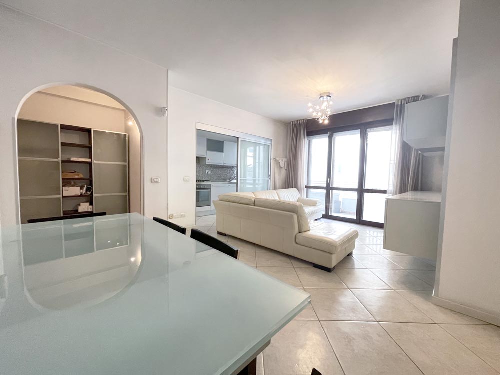 L’ingresso si apre sul soggiorno generoso e luminoso con cucina completamente accessoriata attualmente divisa dalla zona giorno da un importante porta scorrevole in vetro satinato per garantire la divisione degli spazi.