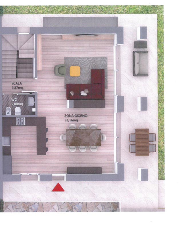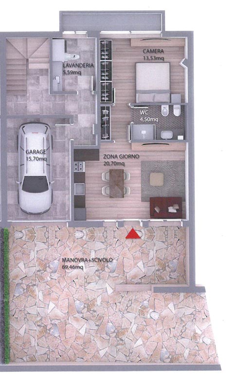 Piano terra di circa 77 mq. zona giorno composta da sala, cucina a vista e un bagno.