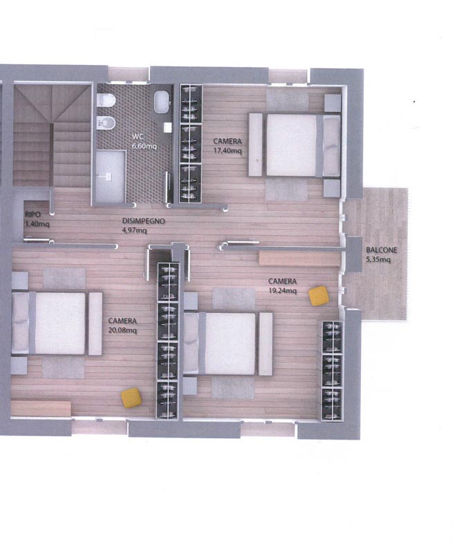 Piano sottotetto di circa 92 mq. zona notte dove poter ricavare tre ampie camere matrimoniali e un bagno, tutti i vani hanno porte finestre.