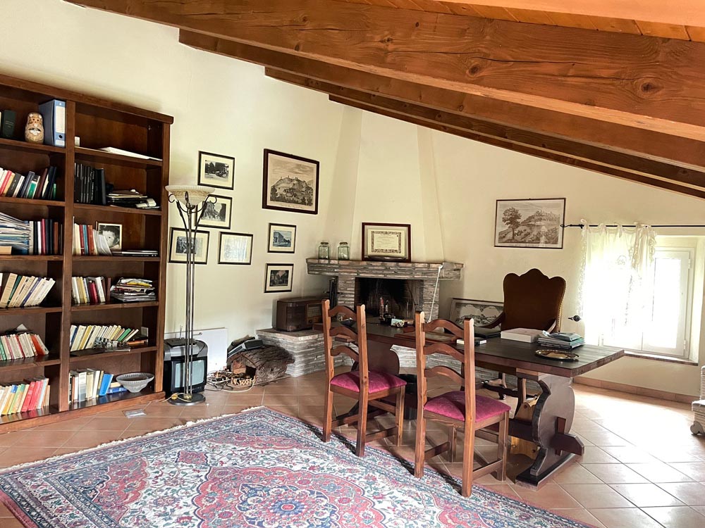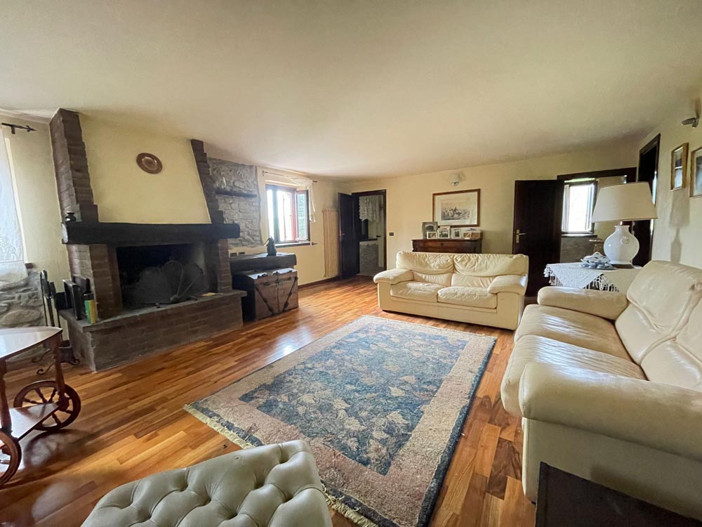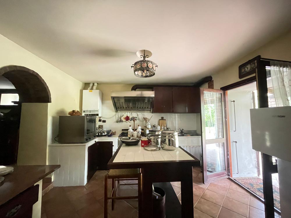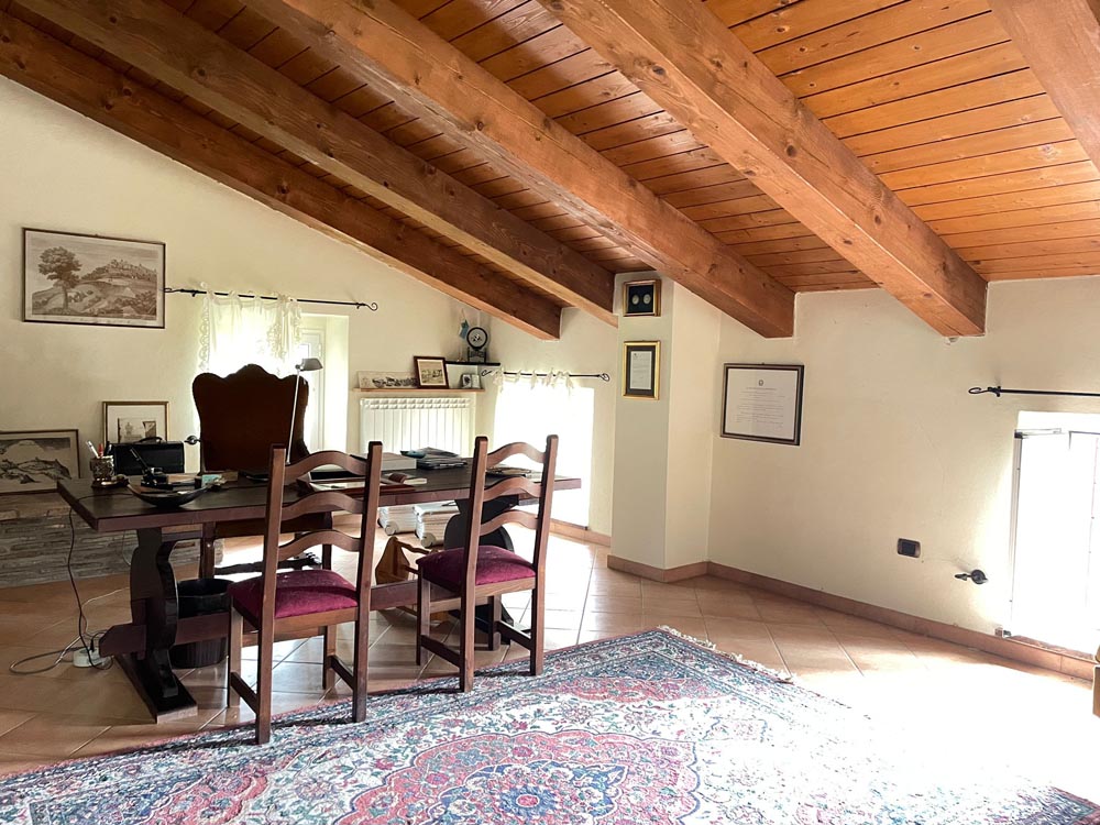 Tramite porticato entriamo all’interno della casa dove ci accoglie un ampio e doppio salone con camino, una cucina abitabile anch’essa affacciata su un porticato che ci conduce al giardino ideale per essere attrezzato per pranzi all’aperto, tramite scala in muratura si accede al piano superiore dove troviamo il reparto notte con 2 camere da letto e un bagno, salendo al piano mansardato troviamo un ampia stanza adibita a studio con camino e bagno.