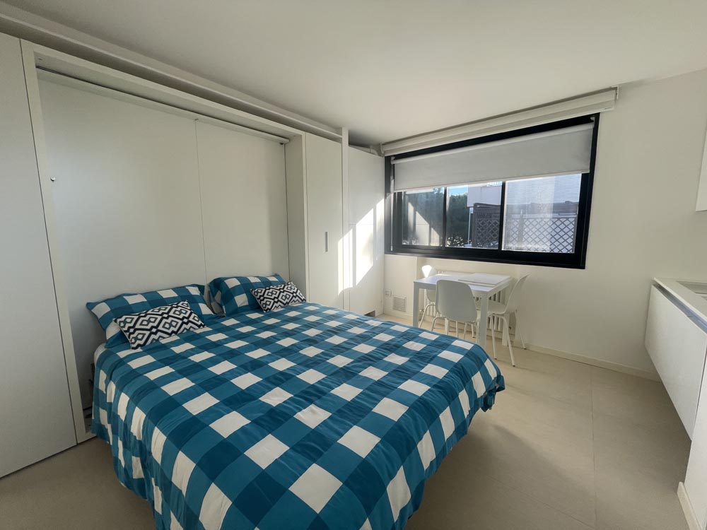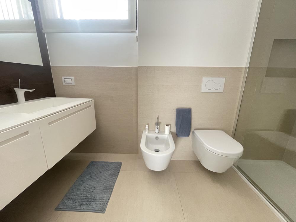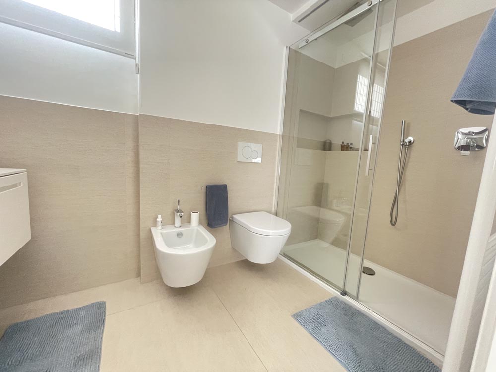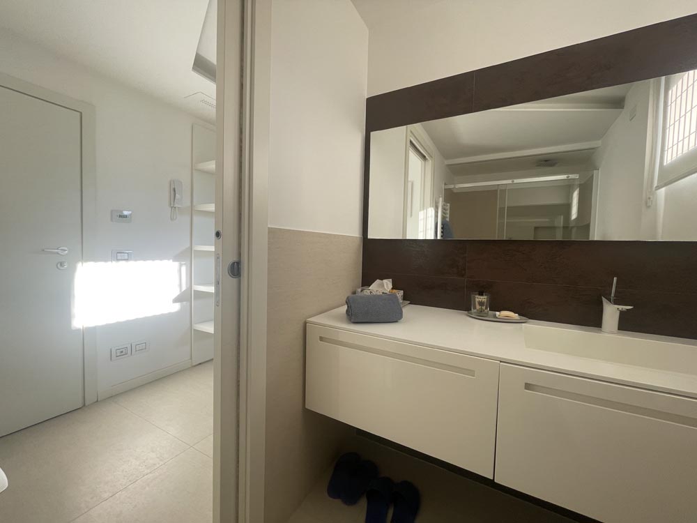 Soggiorno con cucinotto, letto a scomparsa, lavatrice, aria condizionata e ampio bagno finestrato con box doccia e finiture di lusso.